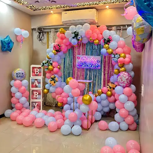 Professional decoration for corporate functions. Beautiful baby shower balloon decoration services creating charming, gentle themes with arches, backdrops, and custom designs for memorable celebrations.